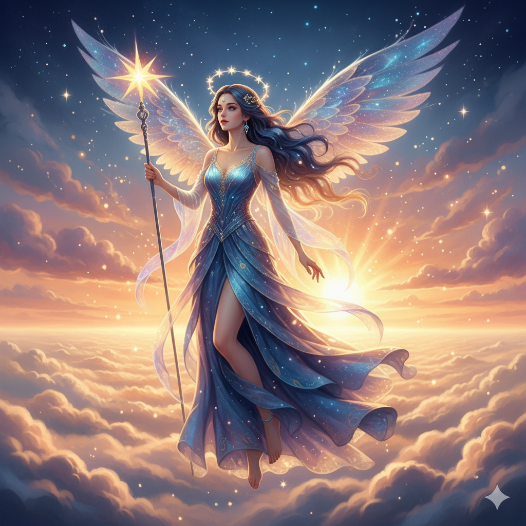 उसके चारों ओर एक हल्की सी नीली-सुनहरी रोशनी है, जो उसकी डिवाइन एनर्जी को दिखा रही है। उसके एक हाथ में कोई जादुई चीज़ है, जिससे थोड़ी सी चमकीली एनर्जी निकल रही है। नीचे की ओर, एक व्यक्ति ध्यान मुद्रा में बैठा है, जिसकी आँखों पर हल्की सी रोशनी पड़ रही है। यह फोटो आध्यात्मिक और रहस्यमयी दोनों फील दे रही है।